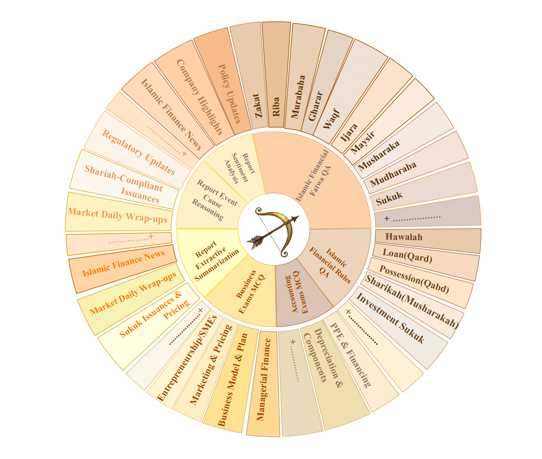 Figure 1: Overview of the SAHM benchmark. The diagram illustrates the seven core Arabic financial NLP tasks and their thematic coverage across Islamic finance, accounting, and business domains.